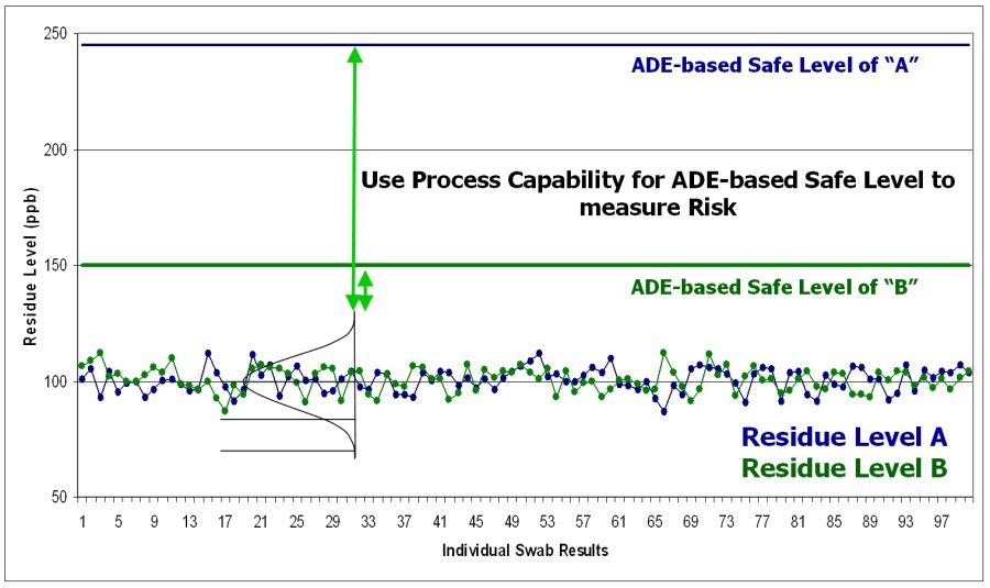 Safe Levels derived from ADEs/PDEs should not be used specifically as Cleaning Limits: they should only be used for the assessment of Risk. Cleaning data collected can be used to determine the Process Capability (Cpk, Ppk) of the Cleaning Process using the MSCs as the specification. The Cpks/Ppks derived are a direct measurement of the degree of exposure and consequently can be used to evaluate Risk. Finally, in line with the FDA's 2011 Guidance of Process Validation, we believe limits should be based on process derived data. Data on Cleaning Processes should be collected and limits should be statistically derived from the data using Statistical Process Control techniques.